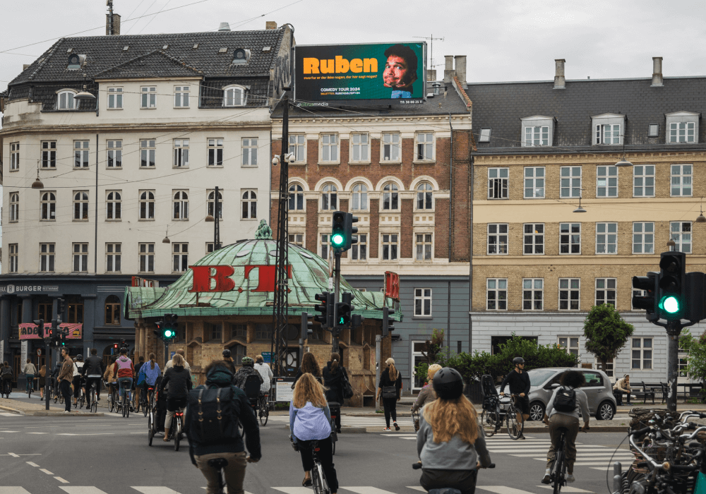 1 large screen of 25 square meters and is the center in relation to the five major roads that meet at Trianglen. The screen is on 24/7 365 days a year.