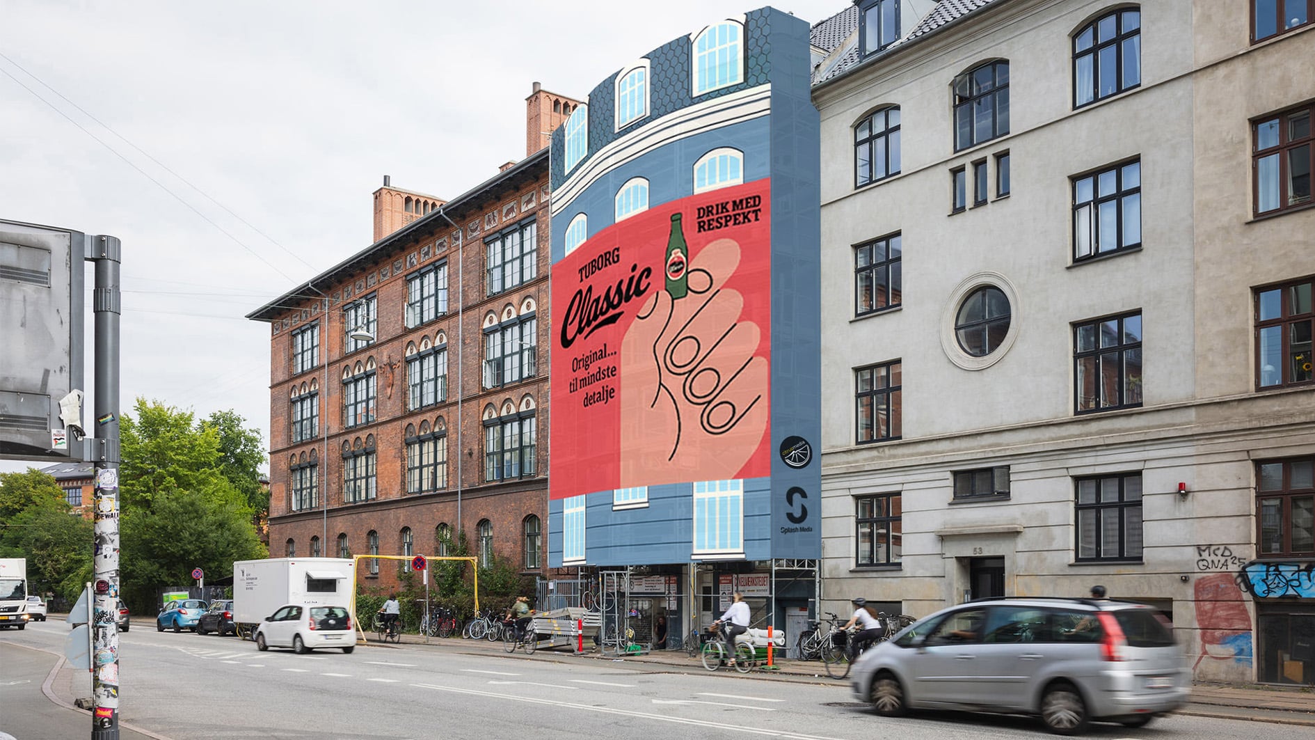 Takket være en buet montering af reklamefladen, får banneret maksimal synlighed fra gaden. Midt i det pulsende Vesterbro er der her en chance for at blive set, husket og forbundet med et af byens mest levende kvarterer.